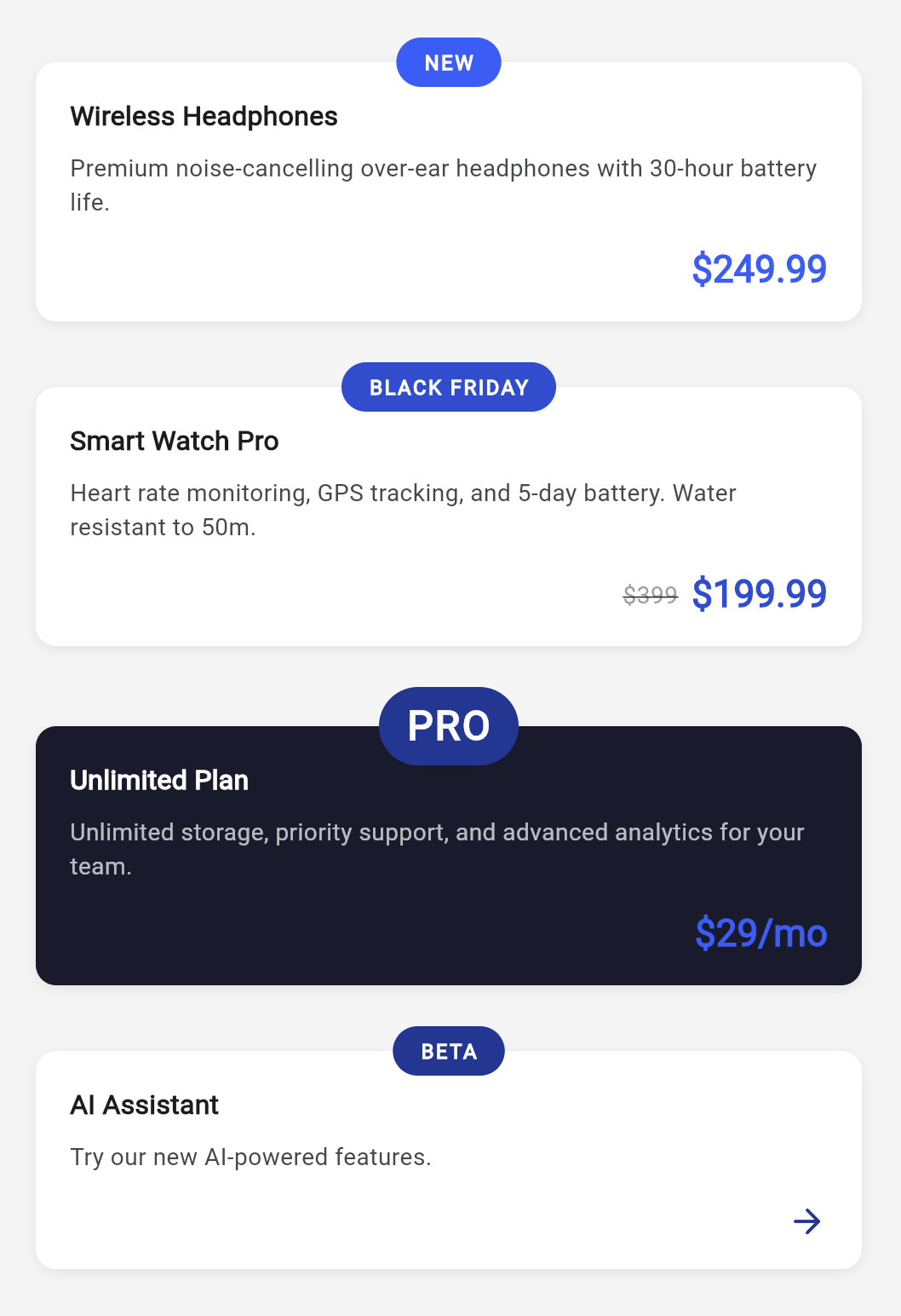 Let's build a concrete example: a card with an overlapping edge tag — the kind of component you'd see on a product card ("NEW", "SALE", "PRO") or a notification badge that straddles the top edge.